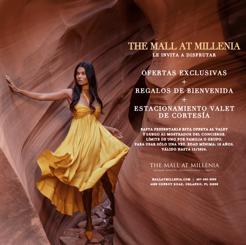 Respaldada por las tiendas por departamento Neiman Marcus, Bloomingdale’s y Macy’s, The Mall at Millenia es la sede exclusiva en la Florida Central de las tiendas Hermès, Chanel, Dior, Louis Vuitton, Gucci, Rolex, Saint Laurent Paris y Tiffany & Co., siendo el destino preferido del visitante global.