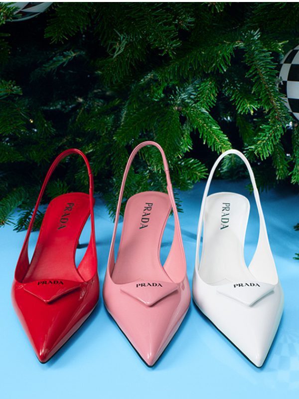 These pumps expressing sophisticated, feminine elegance are made of brushed leather, an emblematic material of Prada since the 90s traditionally used for luxury footwear. The triangle logo returns as a slightly padded leather detail and inspires the geometric line of the heel, which gives the silhouette a modernist note.