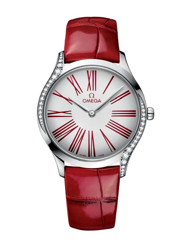 The OMEGA Trésor features 38 diamonds on along its 36 mm case, red Roman numerals, and a red leather strap.