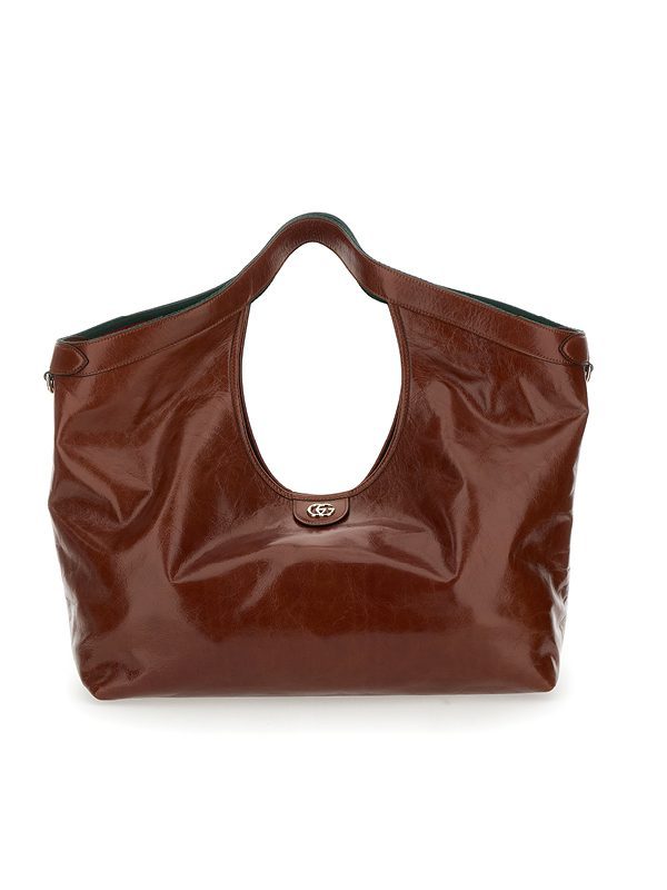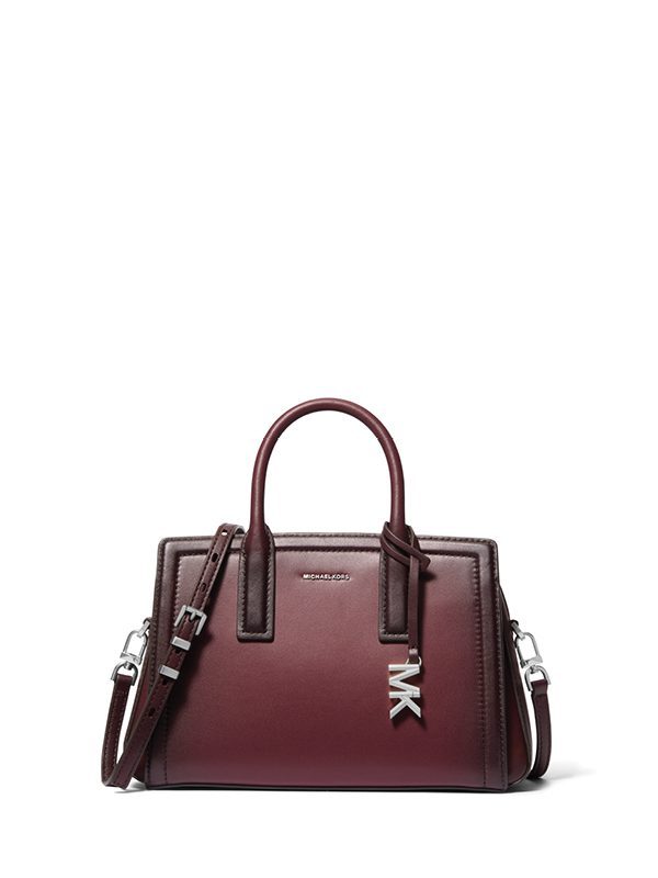Crossbody bag with a detachable, adjustable shoulder strap, handles at top, and an internal carabiner hook fastener. Accessorized with a shear scarf.