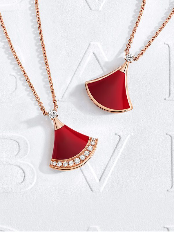 Divas’ Dream necklace with pendant in 18 kt rose gold, set with a carnelian element and pavé diamonds.